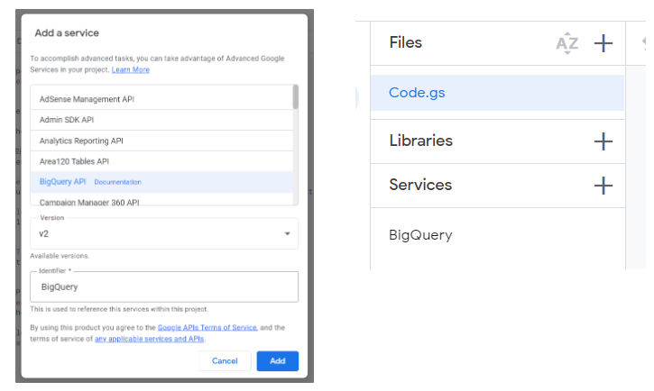 이 페이지는 Cloud Translation API를 통해 번역되었습니다. Switch to English 의견 보내기 BigQuery 서비스 BigQuery 서비스를 사용하면 Apps Script에서 Google BigQuery API를 사용할 수 있습니다. 이 API를 통해 사용